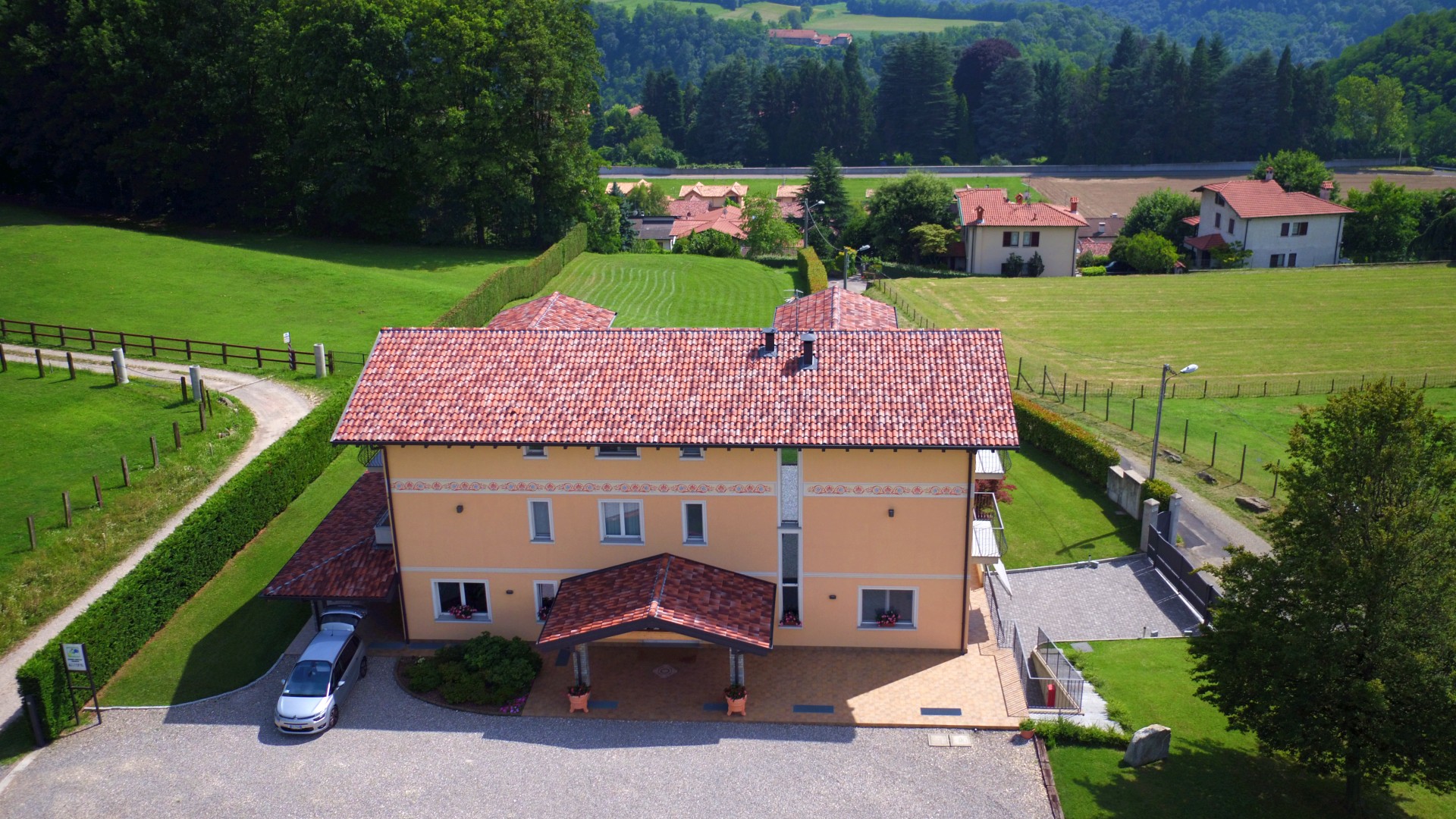 La struttura, disposta su tre livelli fuori terra, si compone al piano terreno di un ampio salone (mq 150) circondato da un favoloso porticato (mq 100), una cucina da ristorante, servizi e spogliatoi; al primo piano troviamo sette camere da letto, di varie dimensioni, ben arredate con servizi e quasi tutte con balcone panoramico; al secondo piano mansardato abbiamo due distinti appartamenti, rispettivamente di 100 e 83 mq, completamente arredati; nell’ampio piano seminterrato (mq 300), si trovano ulteriori bagni, sala riunioni, lavanderia, oltre a garage e deposito.